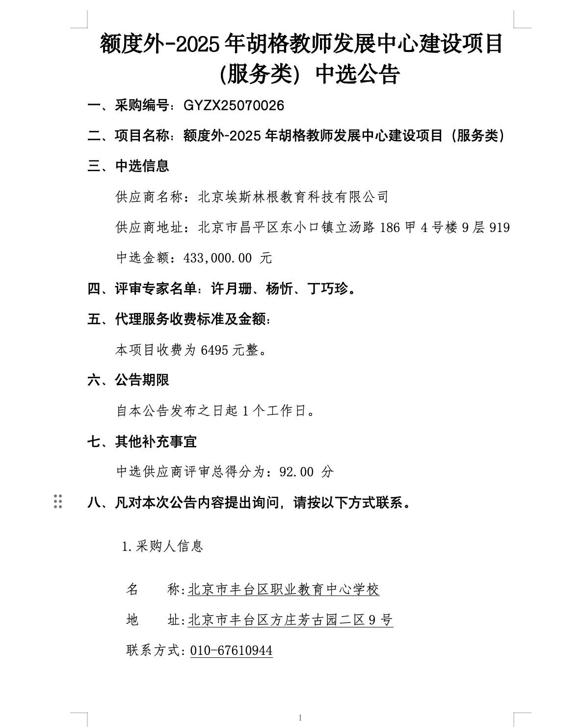 中选公告-额度外-2025年胡格教师发展中心建设项目 (服务类)