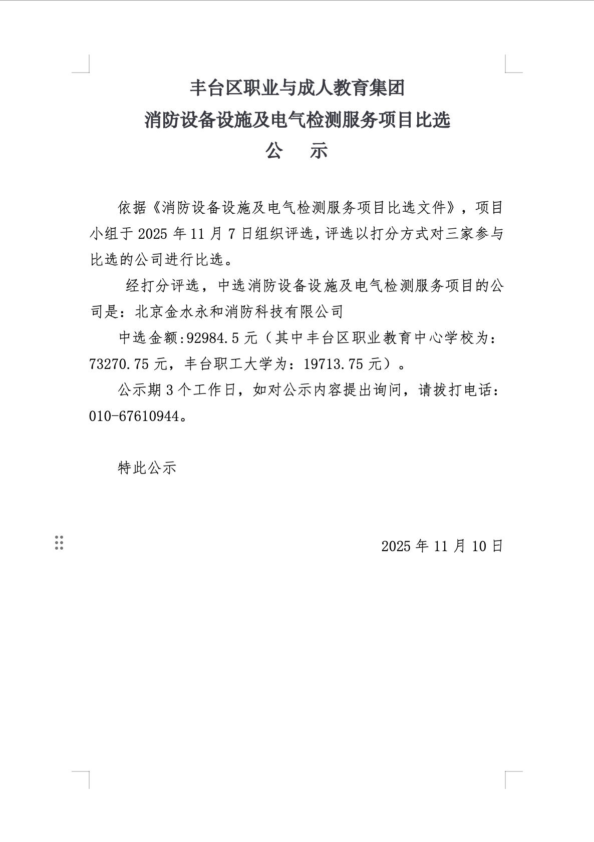 比选公示-丰台区职业与成人教育集团 消防设备设施及电气检测服务项目比选